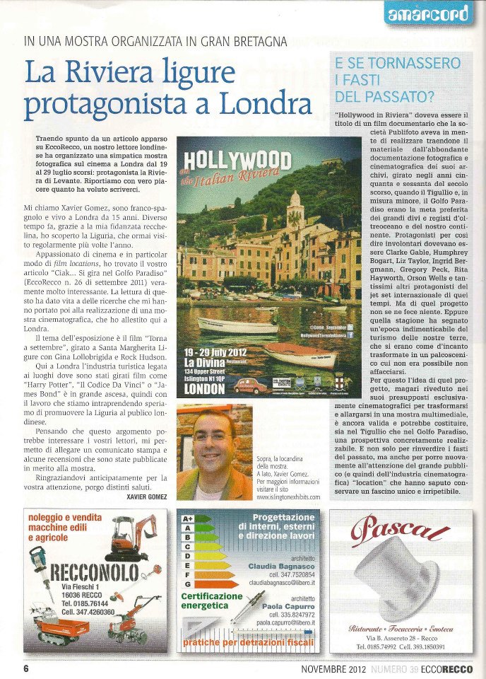 EccoRecco, a free monthly magazine from the town of Recco, Liguria, talked about the London Exhibition: La Riviera ligure protagonista a Londra